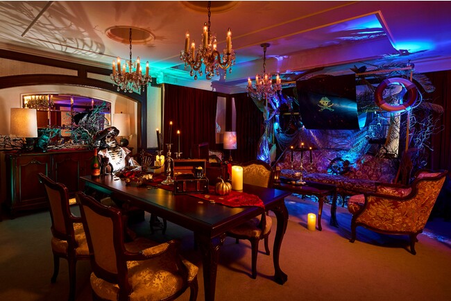 毎年好評のハロウィン期間限定の宿泊プランを今年は、「ご宿泊のみ」と「ディナー・朝食2食付」の2種類のプランでご用意。今回は「彷徨える海賊船」をテーマに、スイート「フォンテンブロー」(82.5平方メートル )をハロウィン仕様に装飾しました。「ディナー・朝食2食付」では客室内で洋食のディナーコースをお召しあがりいただきます。