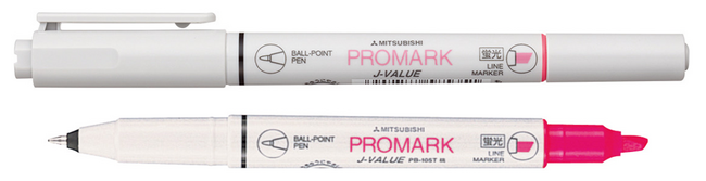 ペンの両端がボールペンと蛍光ペンになっており1本で2役こなすペン。