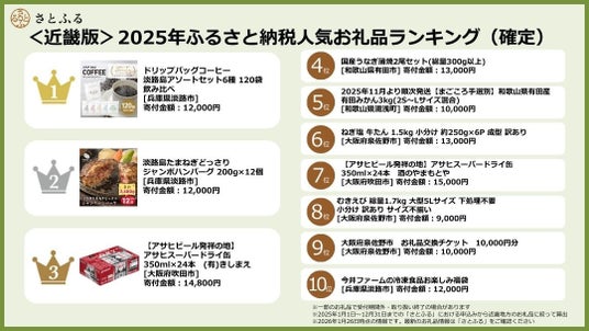 ふるさと納税ポータルサイト「さとふる」を運営する株式会社さとふる(本社:東京都中央区、代表取締役社長 兼 CEO:藤井 宏明)は、「さとふる」における<近畿版>2025年人気お礼品ランキング(確定)(※)を発表します。