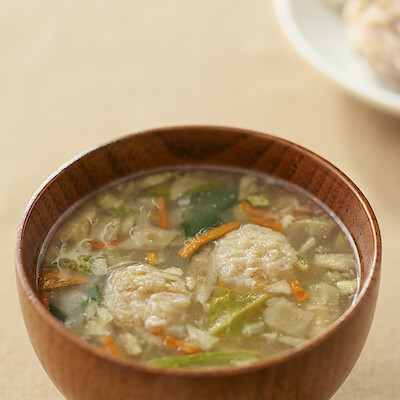鶏つくねとごぼうなどの野菜を合わせた具だくさんの味噌汁です。