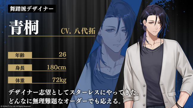 株式会社DONUTS(東京都渋谷区、代表取締役:西村啓成)が運営するスマートフォン向けアプリゲーム『ブラックスター -Theater Starless-』は、8月19日(土)配信の新ストーリーにデザイナー志望として登場していた新キャラクター「青桐」の詳細を初公開し、声優にTVアニメ『るろうに剣心 -明治剣客浪漫譚-』相楽左之助役などで人気の八代拓の起用を発表いたしました。