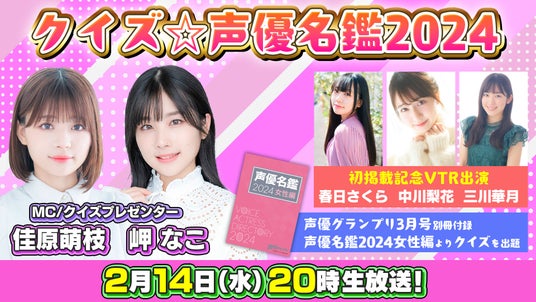 3年目となる特番『クイズ☆声優名鑑2024』のMCを務めるのは、佳原萌枝さん&岬なこさんのお二人。2024年版声優名鑑に初掲載された声優陣(春日さくらさん&中川梨花さん&三川華月さん)がVTRでクイズを出題します!