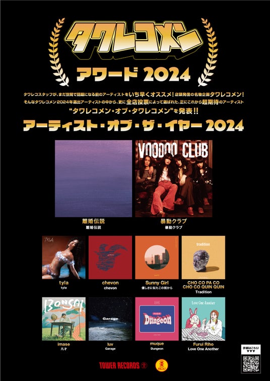 タワーレコードでは、2024年に当社代表バイヤーたちの推薦によりタワレコメンに選ばれたアーティストを対象にあらためて当社全店舗のバイヤーによる投票を行い、その中でもっとも得票数の多かった10アーティストを「タワレコメン・アーティスト・オブ・ザ・イヤー」に選出しました。洋・邦を問わず2024年を一つのシーン代表する作品として、12月21日(土)より店頭にてポスターの掲示を開始し、小冊子を無料で配布するとともに、これら作品を、店頭ならびにタワーレコード オンライン(https://tower.jp)にてプッシュしていきます。※店舗によって開始日が遅れる場合があります。