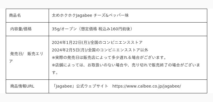 カルビー株式会社(本社:東京都千代田区、代表取締役社長:江原 信)は、じゃがいもの味わいと独自の食感が楽しめる「Jagabee(じゃがビー)」より、通常の「Jagabee」と比べて1.2倍※1の太めカットが特長の『太めホクホクJagabee チーズ&ペッパー味』を、2024年1月22日(月)から全国のコンビニエンスストア先行で期間限定発売します。