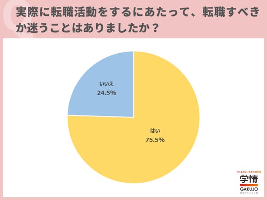 実際に転職活動をするにあたって、「転職するべきか迷うことがある」と回答したビジネスパーソンが75.5%に上りました。8割に迫るビジネスパーソンが、転職活動において、転職するべきか迷うことがあるとしています。
