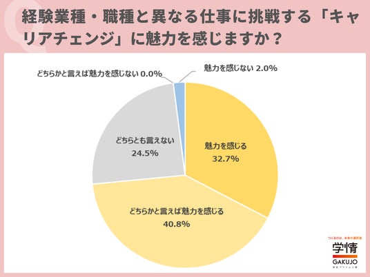 経験業種・職種と異なる仕事に挑戦する「キャリアチェンジ」に「魅力を感じる」と回答したビジネスパーソンが32.7%に上りました。「どちらかと言えば魅力を感じる」40.8%を合わせると、7割以上のビジネスパーソンが「キャリアチェンジ」に魅力を感じていることが分かります。「現職よりも、業務の幅を広げたい」「キャリアの幅が広がるように、選択肢は多く持ちたい」「今後家庭を持つことも想定し、柔軟な働き方が可能な業種・職種にキャリアチェンジしたい」といった声が寄せられました。
