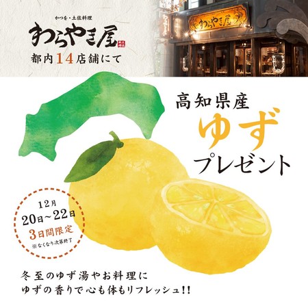 株式会社DDホールディングスの連結子会社である株式会社ダイヤモンドダイニング(本社:東京都港区、代表取締役社長:松村厚久)が運営する土佐料理専門店「わらやき屋」は、ご来店いただいたお客さま全員にゆずをプレゼントする「ゆず活」イベントを12月20日(月)より下記店舗にて実施いたします。