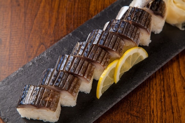 高知では定番の田舎寿司である鯖の棒寿司。脂乗りが良く肉厚な鯖は、皮目を炙ることでほんのり脂が溶け出し、ゆず酢を使った酢飯と調和した美味さとなって口中に広がります。