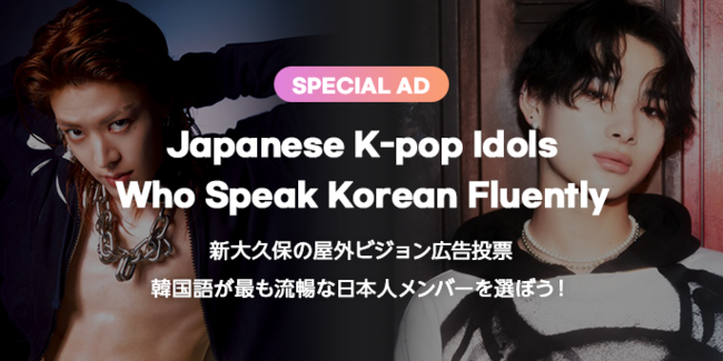 2023年1月11日(水)より開催中の投票「韓国人かと思った!韓国語が最も流暢な日本人メンバーは?」で、最も投票数が多かったアーティストのファンダム広告がJR新大久保駅前の屋外ビジョンに出現します。