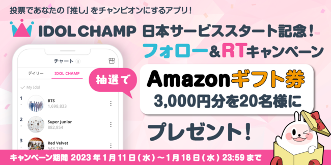 日本サービス開始を記念して、期間中に日本公式Twitterアカウントをフォローし、指定されたツイートをRTした方の中から抽選で20名様に3,000円分のAmazonギフト券を。加えて抽選で100名様に500円相当のCHAMSIMをプレゼントするキャンペーンを開催いたします。