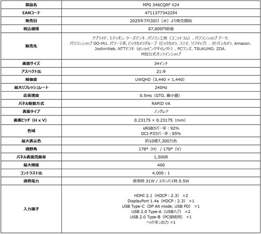 この度、エムエスアイコンピュータージャパン株式会社は2025年7月30日(水)より、ゲーミングモニターの新モデルを発売いたします。高いゲーミング性能と豊富な機能を備えた『MPG』シリーズから、34インチの湾曲UWQHD(3,440 × 1,440)解像度、240Hz・0.5ms(GTG、最小値)の高いゲーミングスペックにより、動きの激しいゲームタイトルも滑らかに表示でき、KVMスイッチやUSB PD98W、Gaming Intelligenceに対応で、性能・機能・快適性を備えた「MPG 346CQRF X24」が新たにラインナップに加わります。