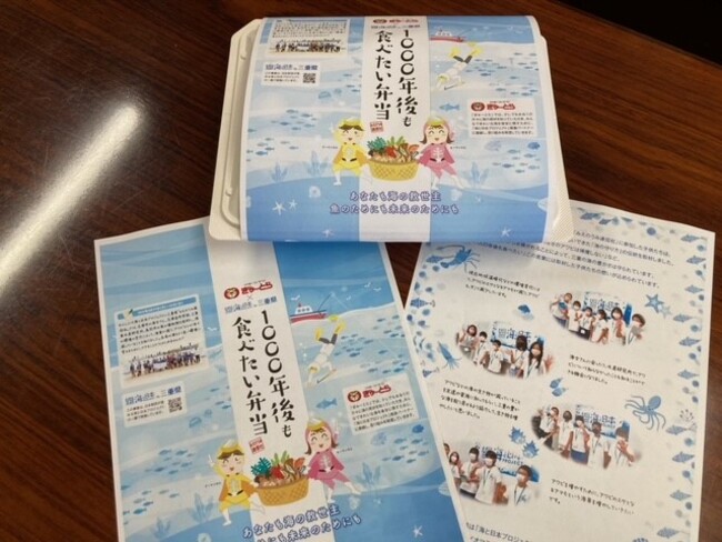 出来上がったお弁当の包装紙には、子どもたちが考えて付けたタイトル「1000年後も食べたい弁当」と、伝えたいメッセージ「あなたも海の救世主 魚のためにも未来のためにも」と書かれ、イラストも子どもたちの絵がもととなっています。裏面にも子どもたちの想いが書かれていて、メッセージがいっぱい詰まっています。