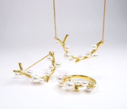 K18YGアコヤ真珠ブローチ・ペンダント・リング《梅の花》