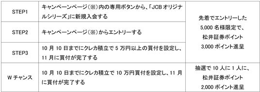 JCB発行のJCBオリジナルシリーズに新規入会し、クレカ積立で5万円以上の買付をされた方に、松井証券ポイント3,000ポイントを進呈いたします。更に、クレカ積立を10万円買付された方の中から抽選で10人に1人に、松井証券ポイント2,000ポイントを進呈いたします。