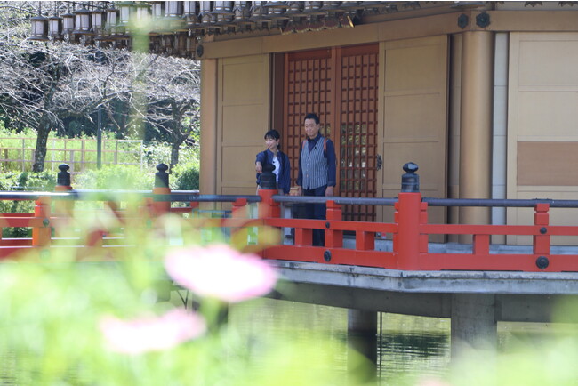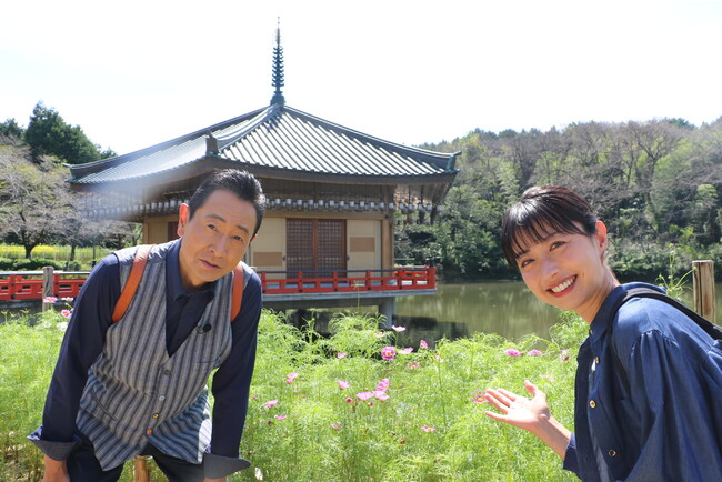 旅のお相手は小塚舞子。2人はまず安倍文殊院へ。日本一大きな菩薩像の国宝・騎獅文殊菩薩像を拝観し、旅の安全を祈願します。
