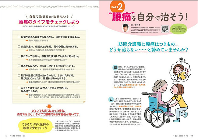 近年、腰痛に対する治療法や考え方は大きく変化し、腰痛は「動いて治す」が新常識になっています。特集のPART 2「腰痛を自分で治そう!」では、簡単な腰痛予防の体操を紹介。また、「自分を守る!介助術」のページでも、腰痛から自分を守る介助のコツを取り上げます。心と体をしっかりケアして、自分を大切にすることを習慣にしましょう。