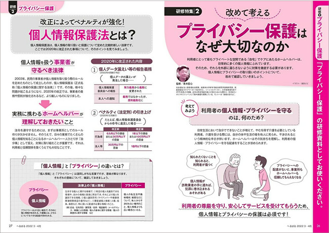 1月31日(月)発売の『へるぱる 3・4月』では、「もう限界」になる前に予防するための、心と体の疲れをケアについて特集。また、日ごろの業務における「個人情報・プライバシー保護」について改めて学びます。