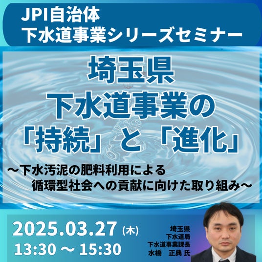 JPI(日本計画研究所)は、埼玉県 下水道局 下水道事業課長 水橋 正典 氏を招聘し、埼玉県における下水道事業の「持続」と「進化」及び 下水汚泥の肥料利用による循環型社会への貢献に向けた取り組みについて詳説いただくセミナーを開催します。