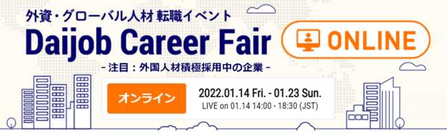 グローバル人材向けのオンライン転職イベント「第6回Daijob Career Fair ONLINE」を、2022年1月14日(金)14:00~23日(日)23:59に開催します。(※初日1月14日(金)14:00~18:30のみライブ配信あり)今回はグローバル人材の中でも特に、「英語ネイティブ人材」を求める企業の参加が多数あり、高い英語力を仕事に活かしたい方たちに、多くの転職の機会を提供します。さらに、イベント内では転職の成功率アップをサポートする「転職お役立ちセミナー」も開催されます。