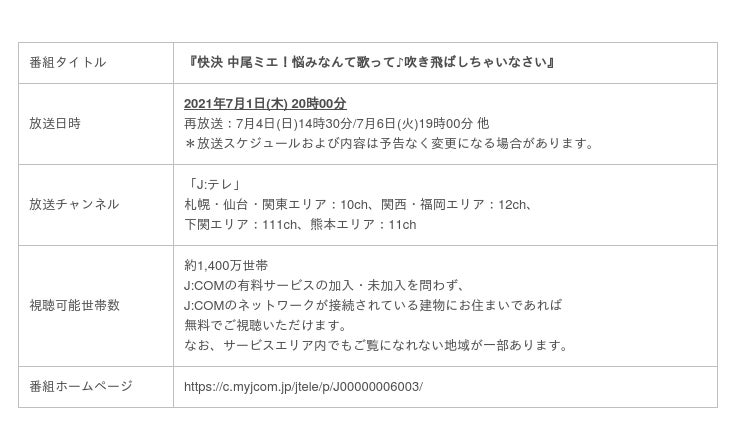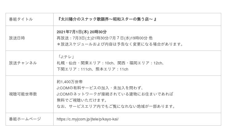 株式会社ジュピターテレコム(J:COM、本社:東京都千代田区、代表取締役社長:石川 雄三)は、2021年7月1日(木)20時より『快決 中尾ミエ!悩みなんて歌って♪吹き飛ばしちゃいなさい』、20時30分より『太川陽介のスナック歌謡界~昭和スターが集う店~』を全国約1,400万世帯で視聴可能なJ:COMのコミュニティチャンネル「J:テレ」で放送開始します。