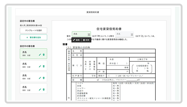 不動産の賃貸借契約において「家主」「管理会社」「仲介会社」「契約者」等の属性と契約フローを設定できるので、現在の契約業務の流れを変えることなく電子契約を運用できます。