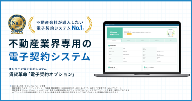 日本マーケティングリサーチ機構が、2022年4月に電子契約システムにおいてインターネット調査を実施した結果、日本情報クリエイト株式会社が提供する「賃貸革命電子契約オプション」が、『不動産会社が導入したい電子契約システム No.1』を獲得しました!