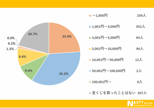 「宝くじを購入する際、平均でいくら使いますか?」という質問については、「1,001円~3.000円」が35.2%、「~1,000円」が23.9%、「3,001円~5,000円」「5,001円~10,000円」がそれぞれ9.4%という順になりました。全体的に見ると、少額を購入されている方が多いようですね。