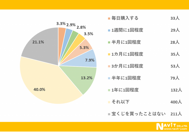 宝くじを購入する頻度については、「(1年に1回)それ以下」が40%、「1年に1回程度」が13.2%、「半年に1回程度」が7.9%という順になりました。