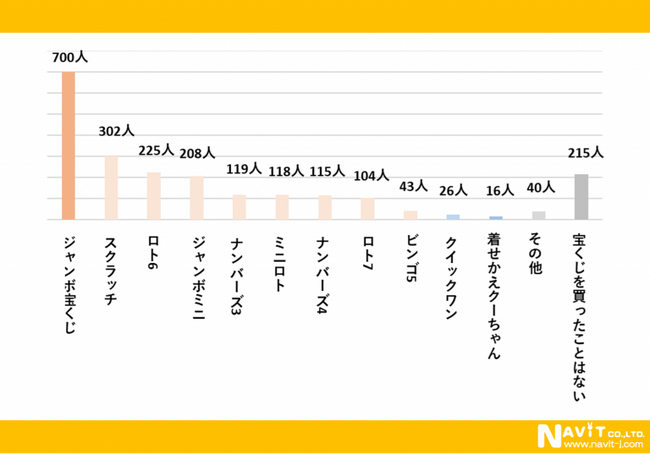 「どの種類の宝くじを買ったことがありますか?」という質問を複数回答可で行ったところ、「ジャンボ宝くじ」が700人、「スクラッチ」が302人、「ロト6」が225人という順になりました。