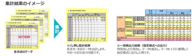 「報告書集計システム」を利用することで、報告部門は報告書の入力と提出、集計部門は報告書の収集と集計作業を簡単なボタン操作で実施することが可能です。また、報告書のフォーマットはExcelなどで簡単に作成や変更が可能です。