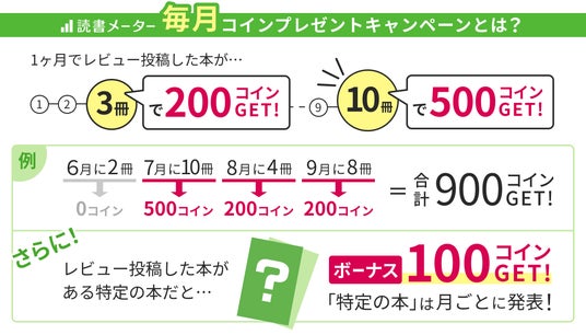 2024年6月~9月で毎月実施。1カ月で3件以上の感想・レビューの投稿で200コイン、10件以上で500コインをプレゼントします。
