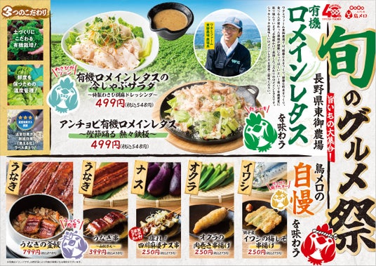 「旬のグルメ祭」では、ワタミファーム東御農場産「有機ロメインレタス」を使用した2種類のサラダをはじめ、ワタミファーム美幌峠牧場産のグラスフェッドミルクに百花はちみつを加えた株式会社山田養蜂場とのコラボレーション商品「はちみつアイス」、ナスやオクラといった夏野菜やうなぎなど旬の素材を使用した鳥メロ自慢の串商品など、全8商品をご用意しております。