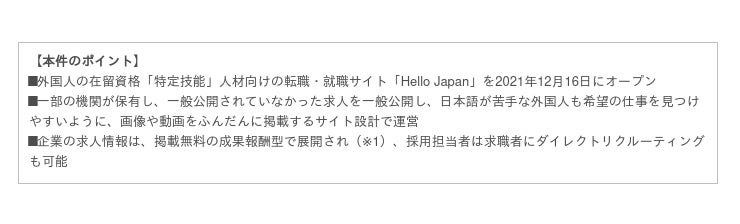 日本国内の深刻な労働人口減少の影響から、外国人の在留資格「特定技能」が2019年に新設されました。さらに2021年11月には、「特定技能」の在留期限を、これまでの5年間から事実上なくす方向で調整が進められていることが、明らかになっています。今なおコロナ下ではありますが、企業からの外国人採用ニーズは高い状況が続いています。その状況を受けて、労働力不足の解消と日本で働きたい外国人をオンラインでつなぐマッチングサイトとして、当社は新たに「Hello Japan」(https://hellojapan.work )をスタートさせました。