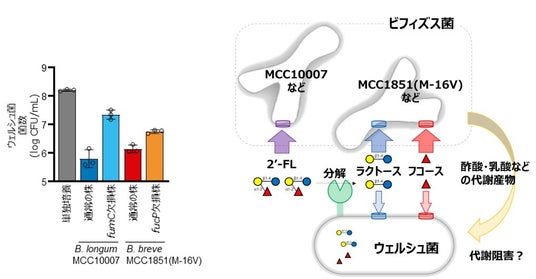 図4:フコースを代謝できないビフィズス菌変異株(fumC,fucP欠損株)とウェルシュ菌を共培養した際のウェルシュ菌の菌数(左図)と作用メカニズムの概念図(右図)