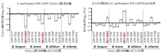 次に、(1)と同様の培地で、ヒトにすむ様々な種類のビフィズス菌とウェルシュ菌を同時に培養した結果、一部のビフィズス菌がウェルシュ菌の増殖や毒素産生を強く抑制することが示されました。