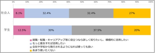 ・一方、デジタルバッジを知らない人でも「就職・転職・キャリアアップに役立つなら積極的に活用したい/普及すれば活用したい」という意見が社会人40.5%、学生42.5%に上る点が注目される。