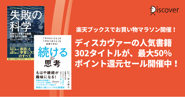 2/4から2/10までの間、楽天ブックスにて、ディスカヴァーの書籍302点が、10~50%ポイント還元になるお買い物マラソンセールを開催中です。
