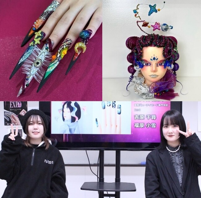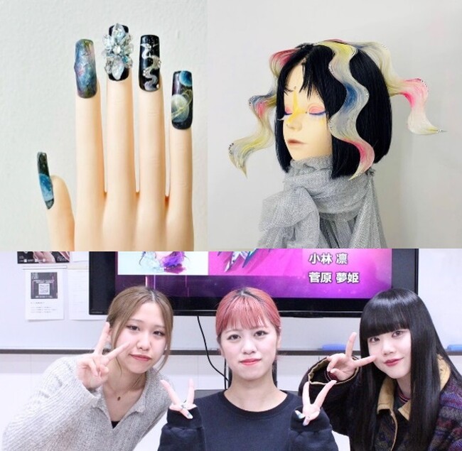 また、この他、ネイルチップとヘアメイク作品の総合力を競う、ネイティフルコンテスト、トータルコーディネート部門においても、全国上位5作品に授与される優秀作品賞に2作品が入賞。ネイルとヘアメイクの総合デザイン力についても高い評価をいただき、学生たちの自信に繋がりました。