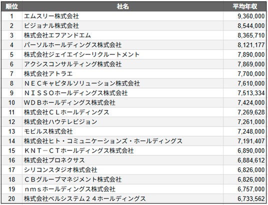 株式会社SalesNow(本社:東京都渋谷区、代表取締役:村岡功規、以下「当社」)は、国内540万社の企業情報を完全網羅した日本最大級のデータベース「SalesNow DB」より、上場企業における人材業界の平均年収ランキングTOP20をお知らせします。
