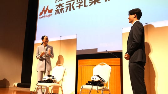 VRお披露目会では森永乳業宣伝部腸の浅田真央さんがサプライズで登壇。新入社員の驚きの声が上がる中、新入社員へエールが送られました。