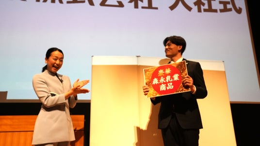 そして、「ガチンコVRクエスト」では、浅田真央さんと新入社員代表の山下さんが対決。「ビフィズス菌!」と声を使った攻撃では、両者とも必死で叫んで高得点を狙いました。結果は、浅田真央さんは78,800ポイント、山下さんは34,200ポイントで、浅田さんの圧勝!勝った浅田さんには森永乳業の豪華賞品の目録を、代表取締役社長の大貫陽一より贈呈しました。勝った浅田さんは「何年もTVCMでビフィズス菌、ビフィズス菌と言っていますし、さすがに宣伝部腸として負けられなかった(笑)」とコメント。最後は、浅田さんから山下さんへの「エール」として目録がプレゼントされ、入社式は締めくくられました。