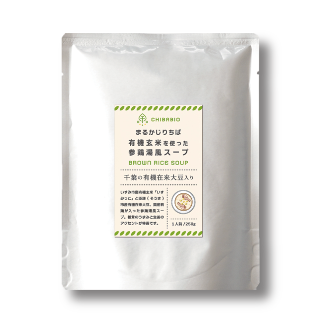 千葉県いすみ市有機玄米「いすみっこ」と千葉県匝瑳市産有機在来大豆、国産若鶏が入った参鶏湯風スープ。椎茸のうまみと生姜のアクセントが特長です。