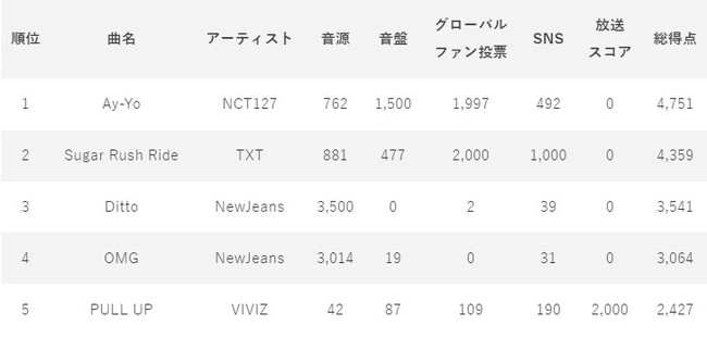 (※)各スコアの割合音源35%、音盤15%、グローバルファン投票(アプリ)20%、SNS10%、放送スコア20%