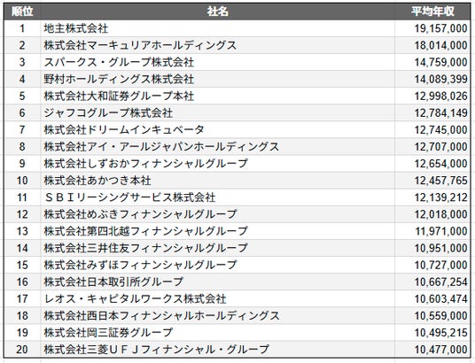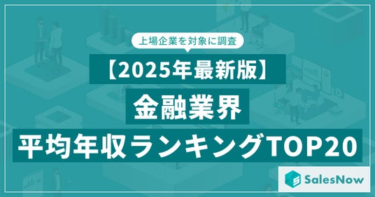 株式会社SalesNow(本社:東京都渋谷区、代表取締役:村岡功規、以下「当社」)は、国内540万社の企業情報を完全網羅した日本最大級のデータベース「SalesNow DB」より、上場企業における金融業界の平均年収ランキングTOP20をお知らせします。