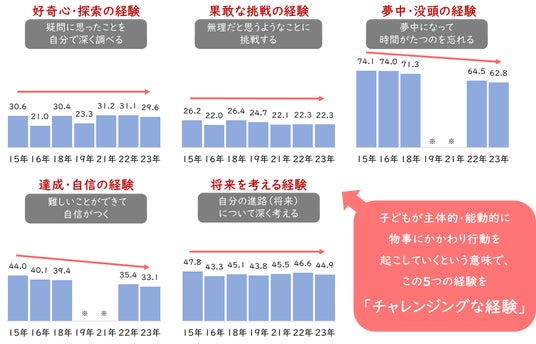 図1:チャレンジングな経験(経年比較、小4~高3生) 【2015~23年データ】(%)