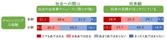 「チャレンジングな経験」が多い子ども(多群)は少ない子ども(少群)に比べて、「社会の出来事やニュースへの関心が強い」(社会への関心)、「将来の目標がはっきりしている」(将来観)を肯定する割合が高い。「チャレンジングな経験」は、社会に対する見方や将来に対する考え方と関連している。