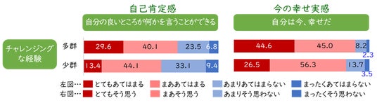 「チャレンジングな経験」が多い子ども(多群)は少ない子ども(少群)に比べて、「自分の良いところが何かを言うことができる」(自己肯定感)、「自分は今、幸せだ」(今の幸せ実感)を肯定する割合が高い。「チャレンジングな経験」は、自己認識や幸せ実感とも関連している。