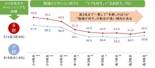 「チャレンジングな経験」が多い子ども(多群)は少ない子ども(少群)に比べて「勉強が好き」を肯定する割合が高いが、その傾向は成長しても続く。小4時点で「チャレンジングな経験」が多い子どもを9年間追跡したところ、高3時点まで一貫して「勉強が好き」を肯定する傾向がみられた。