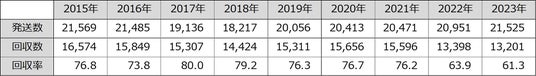 【調査方法】調査依頼は各回とも郵送で実施、回収は2015年郵送・WEB併用、16~20年郵送、21年郵送・WEB併用、22~23年WEB