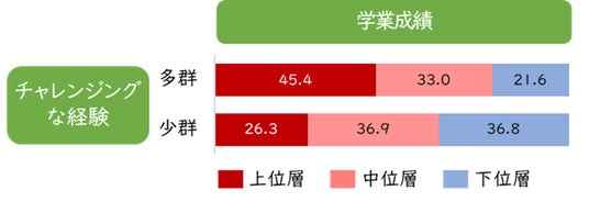 「チャレンジングな経験」が多い子ども(多群)は少ない子ども(少群)に比べて、学業成績が良い傾向がみられる。多群は少群よりも「上位層」が多く、「下位層」が少ない。